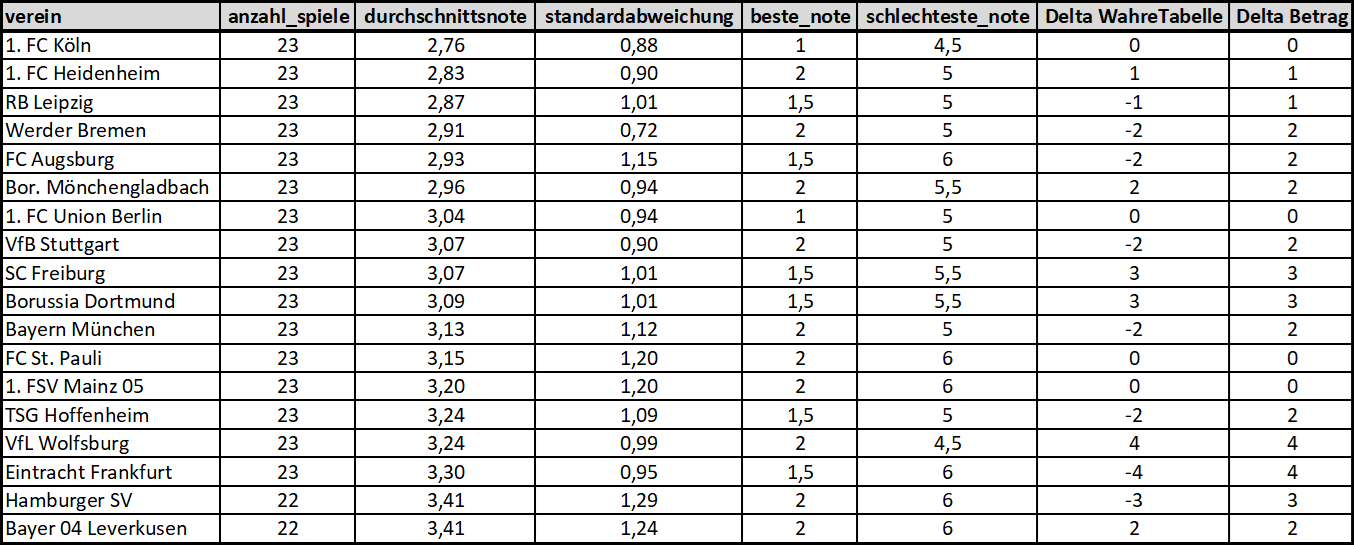 - Ein direkter Zusammenhang zwischen der Durchschnittsnote und dem aktuellen Tabellenplatz in der Bundesliga ist natürlich vollkommener Quatsch.