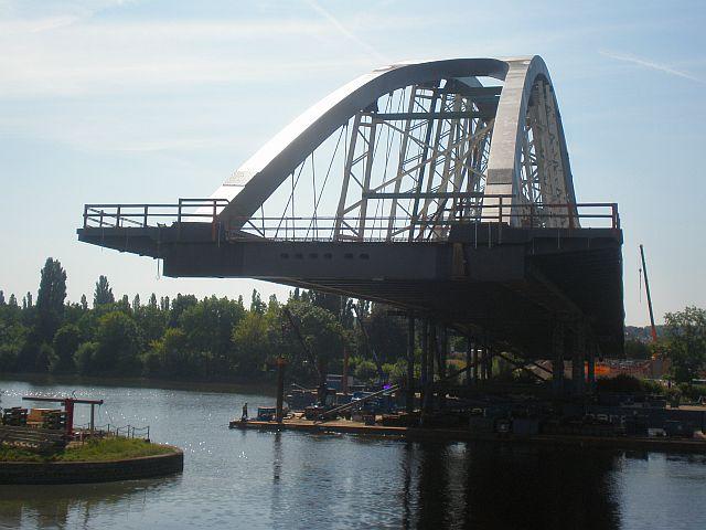 War dann doch eine etwas schwierigere Geburt (das 'Einschwimmen' sollte ja bereits gestern Mittag schon abgeschlossen sein), doch jetzt haben wir das neue Baby: Seit 16:15 Uhr liegt die neue Osthafenbrücke auf der vorgesehenen Stelle!